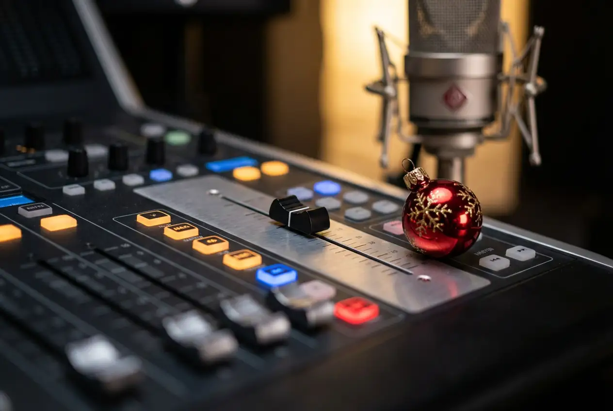 Im festlich geschmückten Studio empfängt dich dein Engineer mit weihnachtlichem Flair – warme Lichter, entspannte Atmosphäre und gute Laune inklusive.